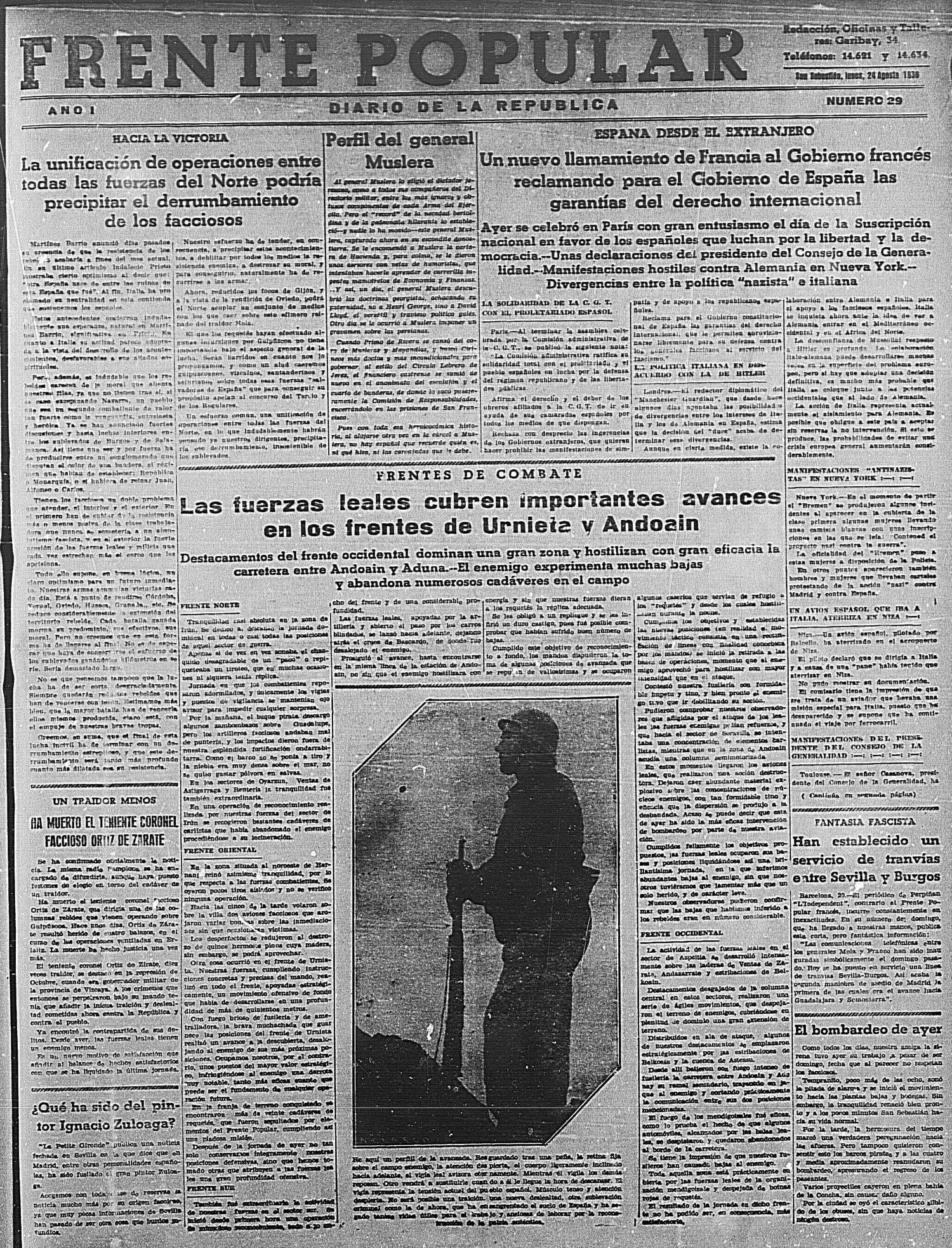 Ha muerto el teniente coronel faccioso Ortiz de Zarate, que dirigía una de las columnas rebeldes que vienen operando sobre Guipúzcoa. Hace unos días, Ortiz de Zárate resultó herido de cuatro balazos, en el curso de las operaciones ventiladas en Erlaitz. La muerte ha hecho justicia una vez más.